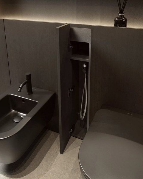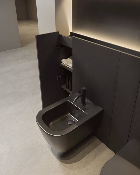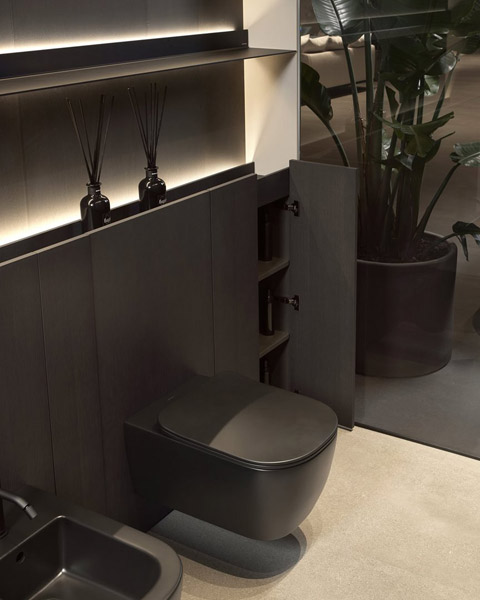 AL_Offset becomes the supporting wall for the sanitary ware, accommodates capacious compartments in which to store towels or other, and can house the hydrobrush module. At the top, the doors conceal a practical storage channel/shelf. Finishes, materials and colors allow to interpret the design and characteristics of the environment, transforming a functional element into a protagonist of the environment.