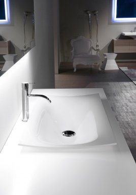 A sheet, a thin layer of material formed from water and bent by gravity on a bearing surface remaining almost suspended to hover in the air. As light as a sheet of paper, suspended like a feather that seems only slightly lapping the surface, softened by the force of the water it has changed the flatness and transformed perfectly square Foglio is a semi recessed basin in Flumood or Colormood with a large and open basin and a base of reduced dimensions that almost disappears from view further amplifying the feeling of suspension with respect to the top.