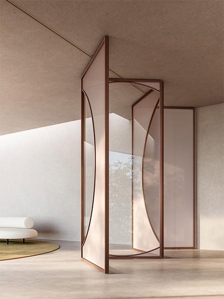 The rototranslating system allows the panels to rotate on their own centre distance and move up to the wall without the need for any floor track. This technology allows you to have panels up to 130 cm wide, which, when closed, are perfectly aligned to the walls and, when open, free up over 90% of the passageway.