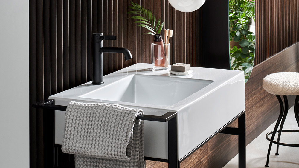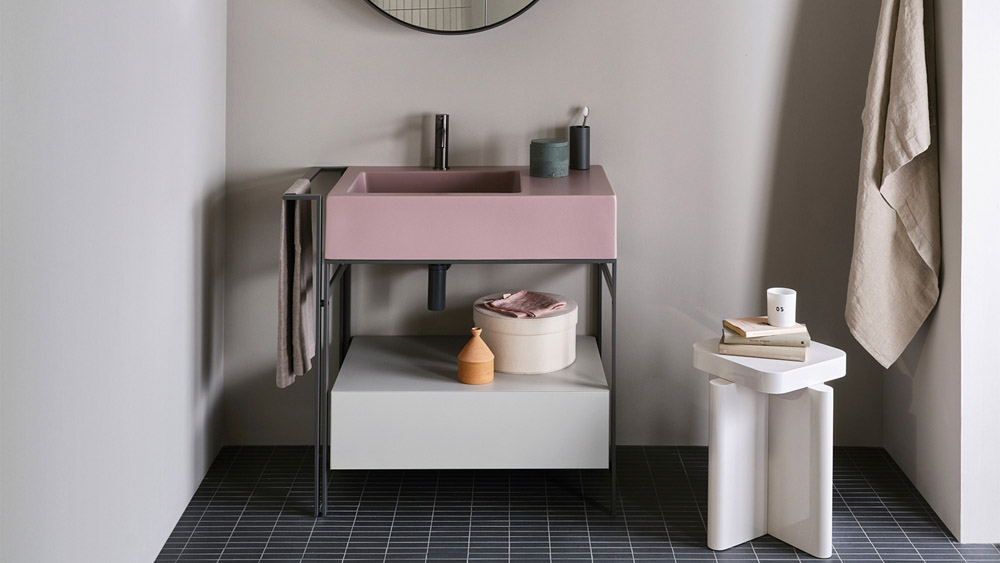 This is an innovative washbasin in ceramic with a large basin and a convenient top. It comes in three configurations: a Mini to bring style and function into a small space, Doppio to accommodate two people, and the Vanity that integrates a wooden storage element to hold beauty products and a mirror. With so many options to customize, it is a very elegant, functional and versatile product. The washbasin is available in different ceramic finishes. The make-up storage element can be lacquered or come in a wooden finish. The framework is made of painted steel and available in different colors. The console can even be enriched further with a full range of accessories: a lateral towel-rail, a laundry bag in real leather, and two drawers.