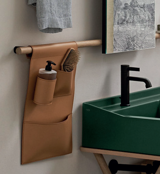 Elegant and refined elements that complete the bathroom in a practical way and offer a new point of view to the spaces. Leather bags and pouf containers amplify the dimensions of the environment.