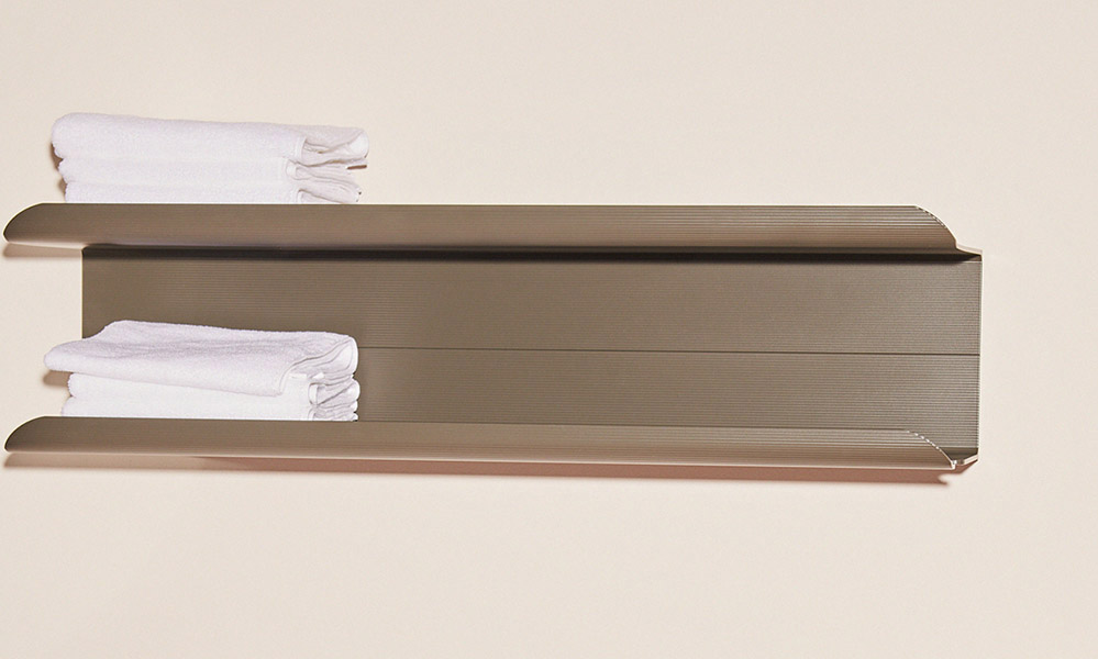 Made from a block of partially recycled and entirely recyclable aluminium, Dots. can be customized in one or many of the 140 RAL colours of Tubes colour chart, choosing among glossy, matt, pearly or wrinkled variants. In the bathroom, Dots. works as a heated towel rail for towels and bathrobes. Although it is electrically powered, the extra-low voltage (24 Volts) means it can also be installed in wet rooms and near water, such as in a walk-in shower or above a bathtub. The recessed part ensures maximum stability on the wall, while an integrated device keeps the temperature constant to the touch. A switch, which is an optional accessory, allows manual switching on and off. In addition, DOTS. can be connected to the electrical system using a thermostat or a control device, including home automation.
