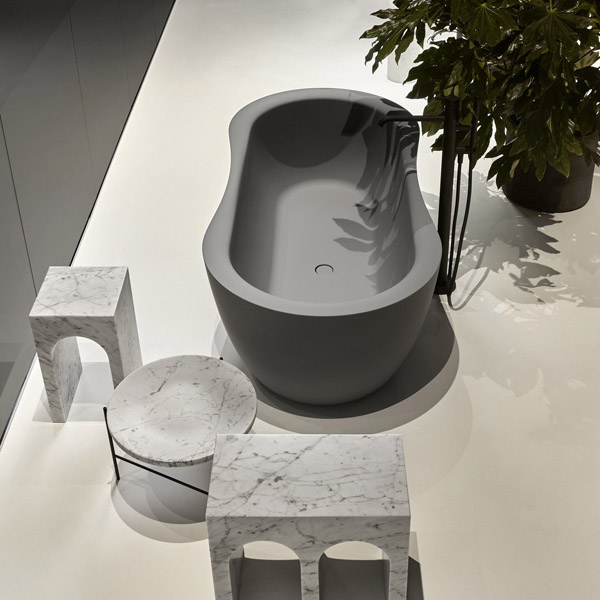 The Fida bathtub is inspired by nature. The outer line takes its cue from the organic shapes of river woods, which give the piece a feeling of fluidity. The edges are beveled and the lines soft. The interior of the bathtub is an ergonomically designed to envelop and give comfort to those who immerse themselves within. Like a real sculpture, carved from a monolith, it is available in various versions of stone and marble, materials that emphasize the idea of a concept related to nature.