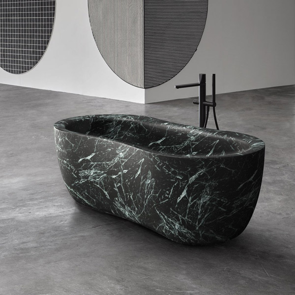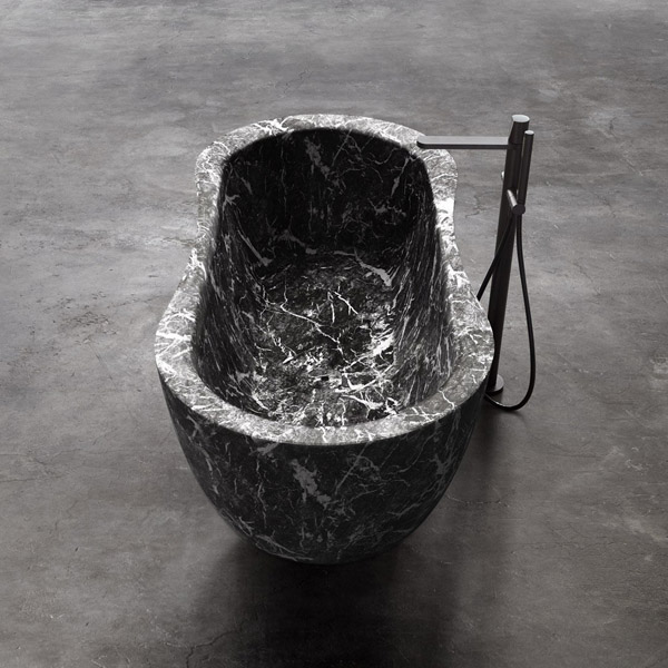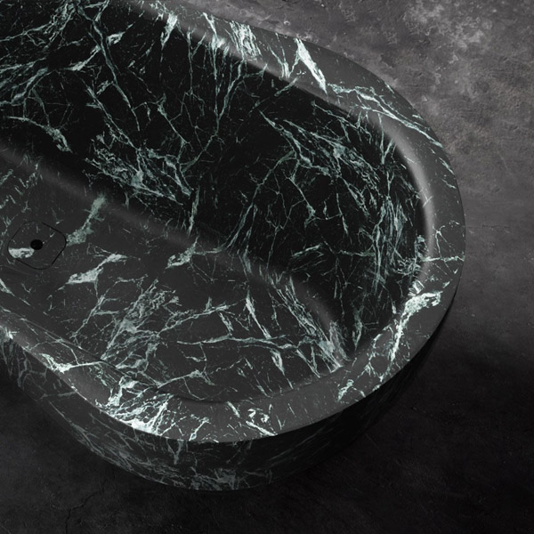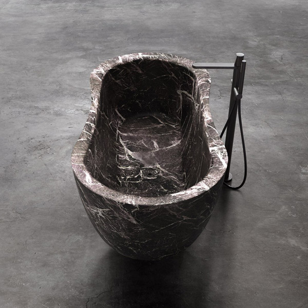 The Fida bathtub is inspired by nature. The outer line takes its cue from the organic shapes of river woods, which give the piece a feeling of fluidity. The edges are beveled and the lines soft. The interior of the bathtub is an ergonomically designed to envelop and give comfort to those who immerse themselves within. Like a real sculpture, carved from a monolith, it is available in various versions of stone and marble, materials that emphasize the idea of a concept related to nature.