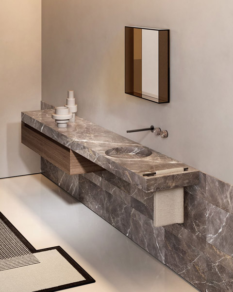 The tops can be used as free shelves or integrated with the different furniture collections in the Antonio Lupi range. In the former case, the design highlights the thickness of the top and its absolute image, in the latter, the infinite shades of marble dialogue with the colors and textures of the fronts of the storage furniture. Fortepiano can accommodate, upon request, a towel rail that can be carved directly into the end of the marble top without adding any accessory element that would undermine its absolute image.