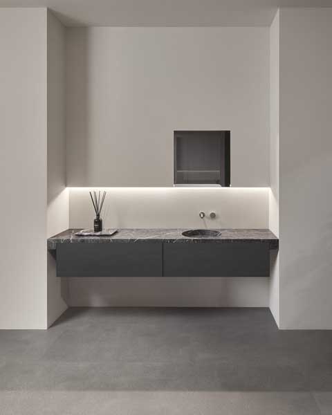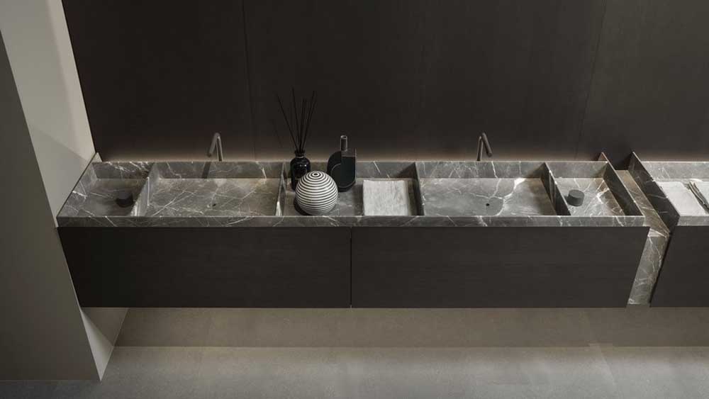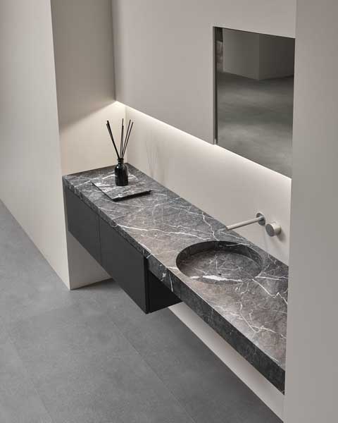 The charm is mysterious because from the front it reveals nothing of its essence, the name is illustrative because by inverting its parts it can be interpreted as an instrument for composing its own symphony of relaxation (just like a piano) or literally expresses its pivotal concepts of consistency, solidity, massiveness. A power, that of the material with which it is made, capable of telling all its strength precisely thanks to the purity and essentiality of the lines, sharp and absolute. Fortepiano is not only a collection of products, but also a new way of thinking about working with marble countertops from solid, modular, or made-to-measure marble, into which round, oval, square or rectangular sinks are carved seamlessly. A continuous surface, then, on which voids and depressions open to accommodate water, almost as if its force were excavating the material.