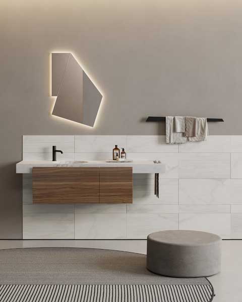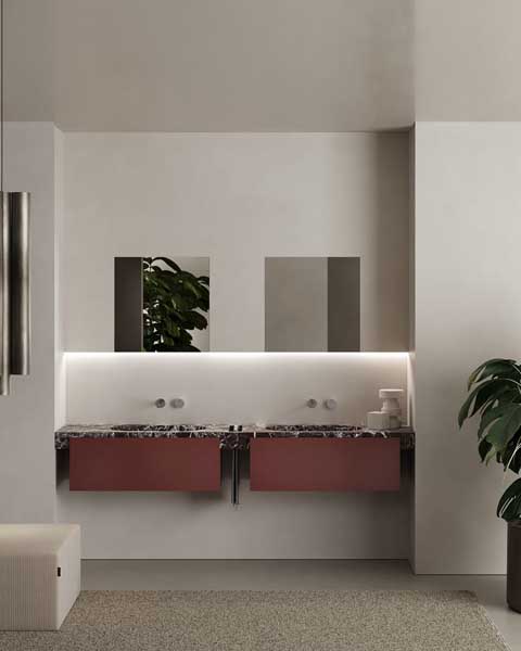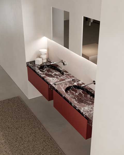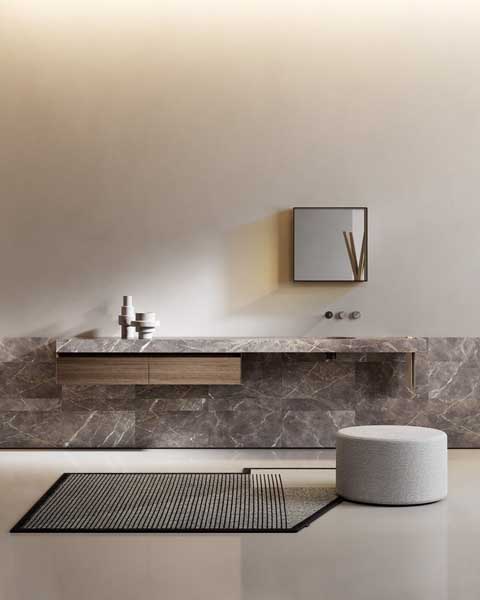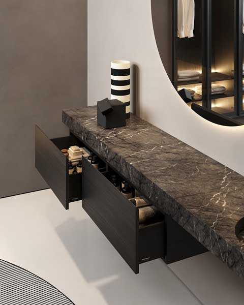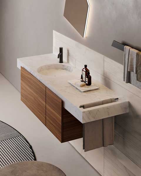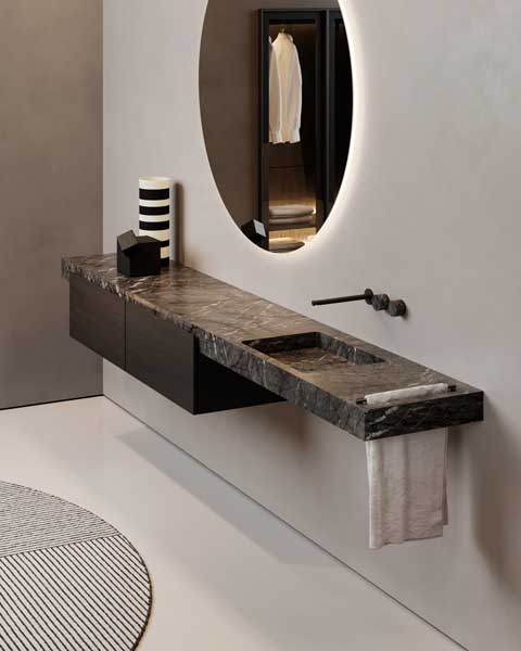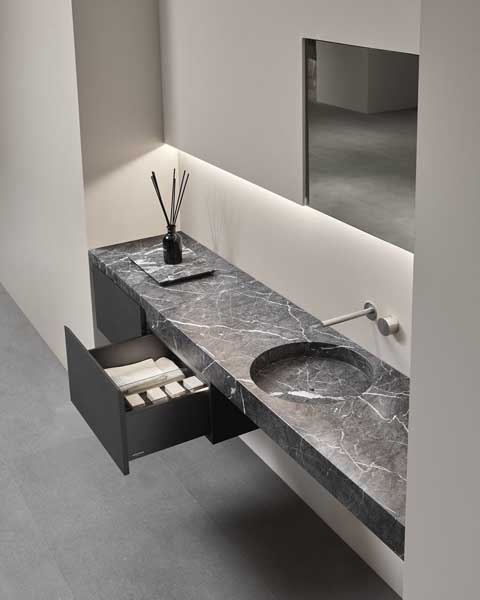 The tops can be used as free shelves or integrated with the different furniture collections in the Antonio Lupi range. In the former case, the design highlights the thickness of the top and its absolute image, in the latter, the infinite shades of marble dialogue with the colors and textures of the fronts of the storage furniture. Fortepiano can accommodate, upon request, a towel rail that can be carved directly into the end of the marble top without adding any accessory element that would undermine its absolute image.