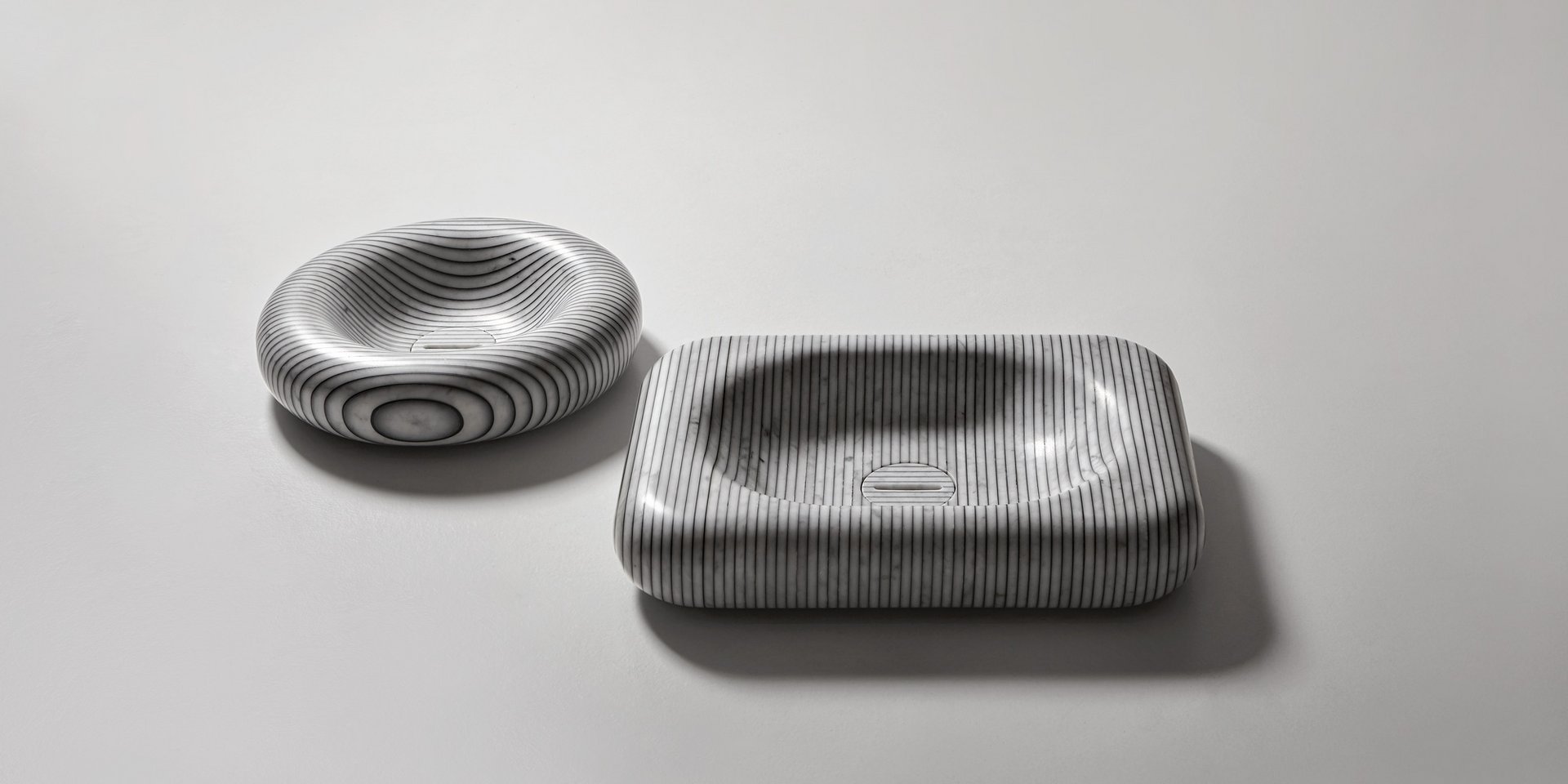 Excellence in the subject, advanced processing technologies, creativity and references to the world of fashion: these are the themes investigated by Gessati project, the collection of top mount sinks that reproduce the motif of parallel lines that identify some items of clothing. A collection that comes from the creativity and thinking of man and is achieved through the precision of the machine, a soft and sinuous volume with enveloping lines obtained by combining 2 cm of Carrara marble sheets glued together by means of a colored resin.