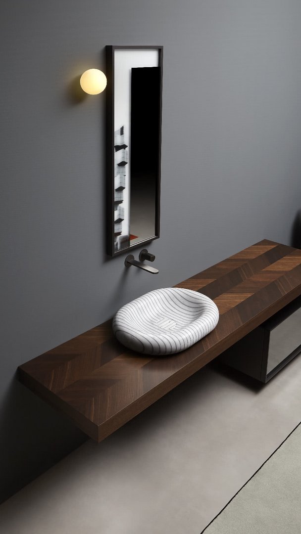 Just the chromatic variation and the contrast that is created between natural material and glue gives a pattern with alternating stripes along the surface, while the perfect sanding of the volume gives an optical effect of great charm. Round, oval or square, Gessati brings energy and personality to the bathroom, thanks to the parallel lines that run on curved surfaces to define new perspectives and directions. The extraordinary personality of marble and its infinite chromatic variations make each sink unique and unrepeatable.