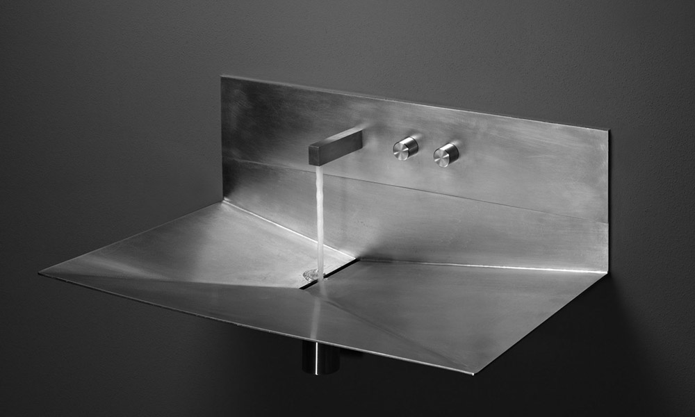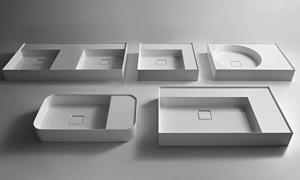 The extreme thinness of the borders define a perimeter that encloses all the functions of the basin: the basin, the back surface where to install the faucet as well an additional surface. One detail made possible thanks to the technological evolution in the processing of the material, an element which not only characterize the aesthetics of the project but allows you to increase the capacity of the basin without changing the overall footprint.