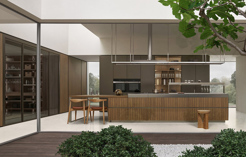 Designed for home chefs, Strip turns the cooktop towards guests, enabling conversation while cooking. American Black Walnut is the common denominator, lending regularity with patterns in its velvety colours and sophistication and style, especially to the doors with their vertical milling that gives them a luxurious refined effect. Strip by Key Cucine dialogues seamlessly with the cooking and living areas, fusing them to make a single, perfectly balanced new room for entertaining and sharing.