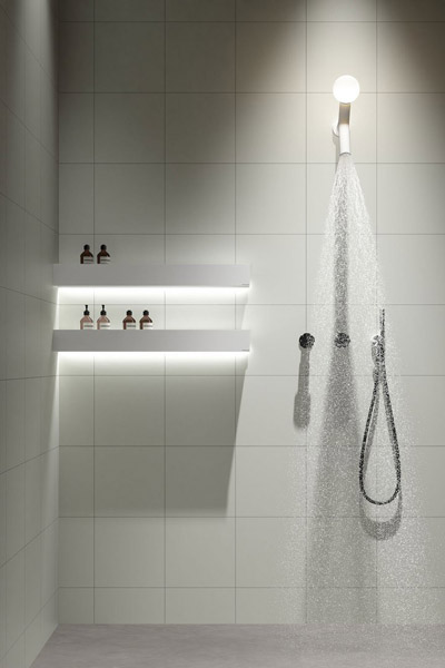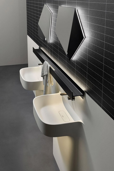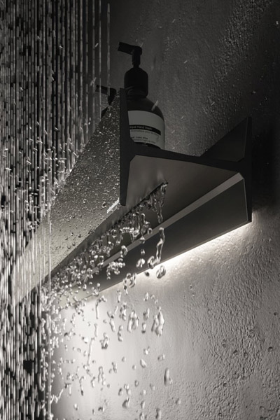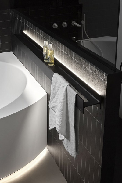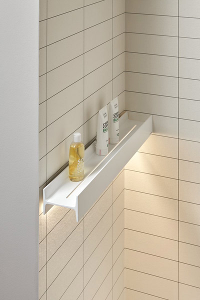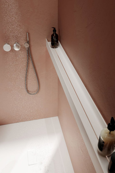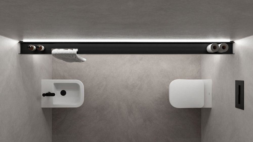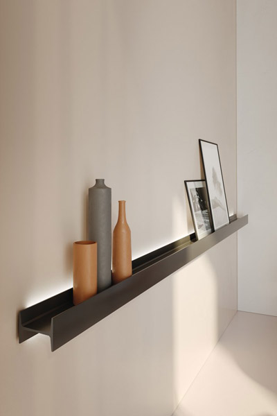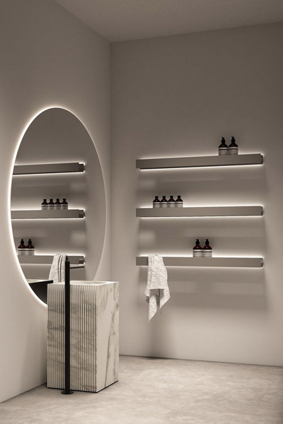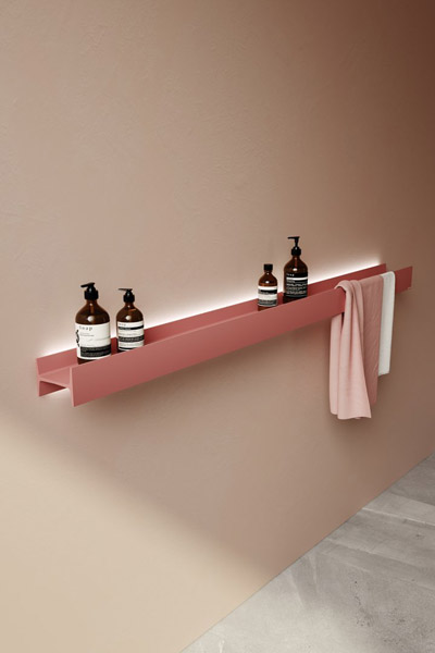 Within the bathroom space, it performs its function of supporting the sink area or adjacent to the bathtub at its best because it allows you to place all the products for face or body care and, if necessary, to integrate a convenient towel holder. If used inside the shower area, a central groove is created in the shelf to allow for a regular flow of water. In any environment it is installed, the shelf can be equipped with integrated LED light, placed both in the lower part to directly illuminate the underlying surfaces, and in the upper part for a more diffused and distributed light upwards. A versatility that makes it perfect for an elegant and contemporary living room, but also for the bedroom or kitchen. Despite its essentiality, Letteramuta offers infinite possibilities for customization and use, associating undisputed functionality with an aesthetic dimension of great effect.