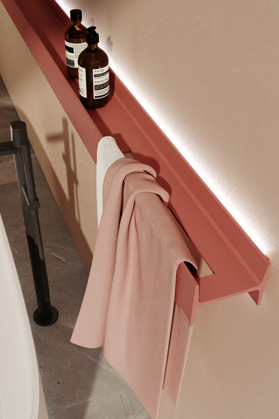 The explicit reference is to architecture, or rather to one of the construction elements that symbolize the steel supporting system often used in modern and contemporary buildings. Three-dimensional geometric figure easily recognizable thanks to the “H” section of the extrusion, the beam has always been associated with an element that develops longitudinally and supports the weight of what rests on it. antoniolupi proposes a transposition of function to give life to Letteramuta, the aluminum shelf that fits, with discretion and elegance, in the bathroom but also in all the other spaces of the house. The essential and clean image hides an unexpected multifunctionality and a wide range of customization options, both in modular and custom-made dimensions, as well as in the aesthetic aspect. Letteramuta is supplied as standard in Embossed White but can be painted in all the colors of the antoniolupi range to better integrate into the color palette of the project.