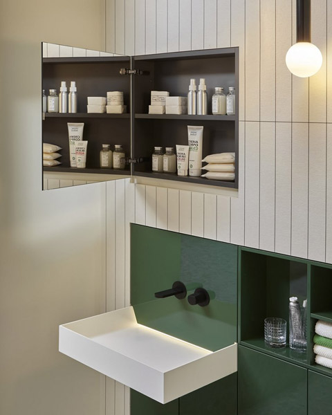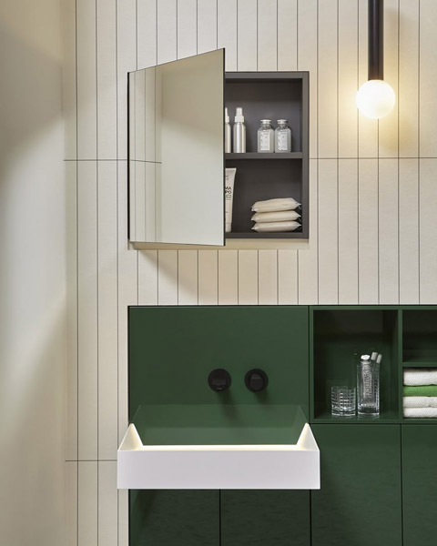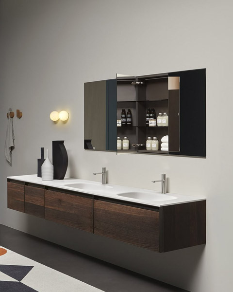 Essential, absolute, free from any ornamentation. The pure geometry, the sharpness of the edges and the perfection of the angles describe an image that can fit in any context. Positioned in sequence, Mantra is a wall hanging cabinet with two double-sided mirror doors which combines aesthetics and functionality by simply hanging it on the wall or recessed in a niche.