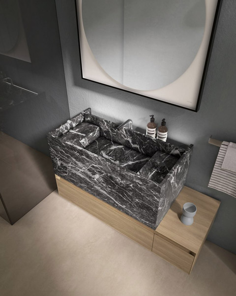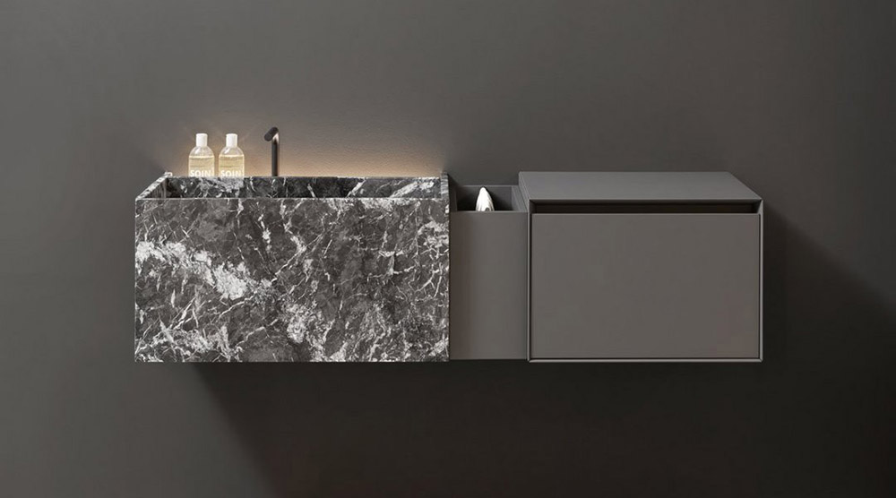 The collection comes to life from the series of tops already presented by Antonio Lupi, and because of this, in addition to the sink, it is arranged to hold everyday objects that find a place in a dedicated and illuminated space near the side. Stone is the great protagonist of these monoliths, the shape of MyStreet comes from the knowledge of the material and man’s work to give it a contemporary shape.
