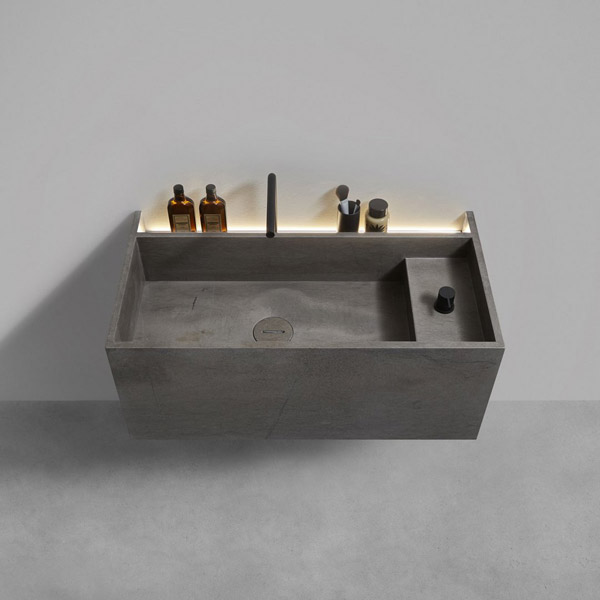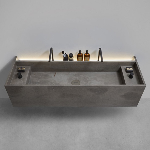 The basin of the sink is large and can be equipped with two side shelves for support on the left or right in perfect aesthetic and formal continuity, following the personal needs of the customer. Many widths are available for the sink , which thus takes on more compact or slender conformations, combinations that are multiplied by the possible variations. In its maximum length, MyStreet can also accommodate two mixers at the same time with their corresponding counter tops. A sink that seems to be carved out of the rock and carries with it the unique traces of history, the nuances, the slight color variations, an open series that allows to meet everyone’s needs and to make the washing area unique and personalized.