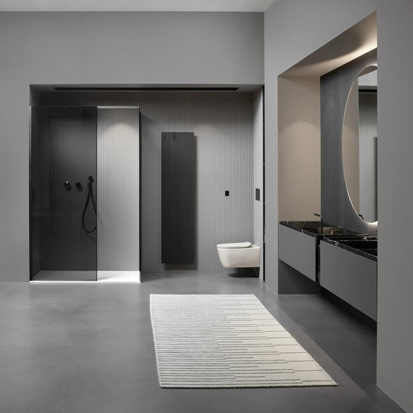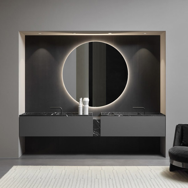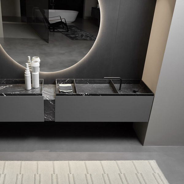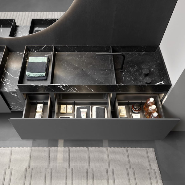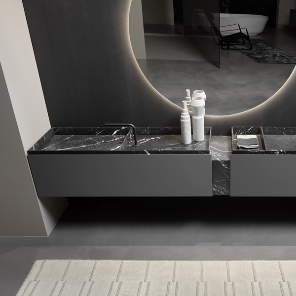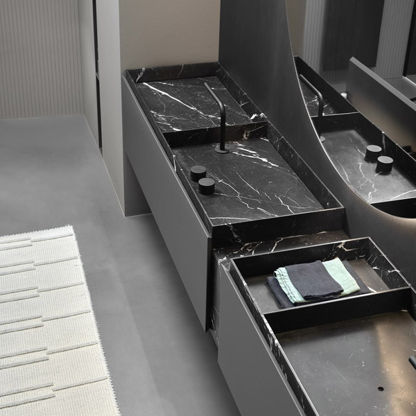 Sculptural and monumental even in their essentiality, carved in stone like the ancient city of Petra, bearers of a value of absolute and timeless beauty that is inherent in the exclusivity of marble and expressed through human design. The Nabatei sinks collection, named after the merchant people of ancient Arabia, consists of a series of solid marble tops carved to form the basin of the sinks and storage compartments. Sinks of different shapes and sizes, drawn by orthogonal geometric lines defined by thin thicknesses of the material. An essential sign that is enhanced by the uniqueness of the stone, the infinite chromatic shades, the unrepeatable variations of color. An explicit reference to nature and man’s willingness to govern it. The zenithal view of the tops reminds of the image of land divided into cultivated plots and bordered by Sicilian dry-stone walls or the elevation changes of eastern cultivated terraces. The different portions of the top separated by the inner edges can house the taps, store objects and accessories for daily use, or take on the primary function of a basin for the washbasin, identifiable by a small hole from which to drain water. The top with sinks and storage spaces are combined with a series of wall-hung or floor-standing cabinets with essential and rigorous aesthetics that go along with that idea of lightness and sense of measure that is in the collection’s DNA.