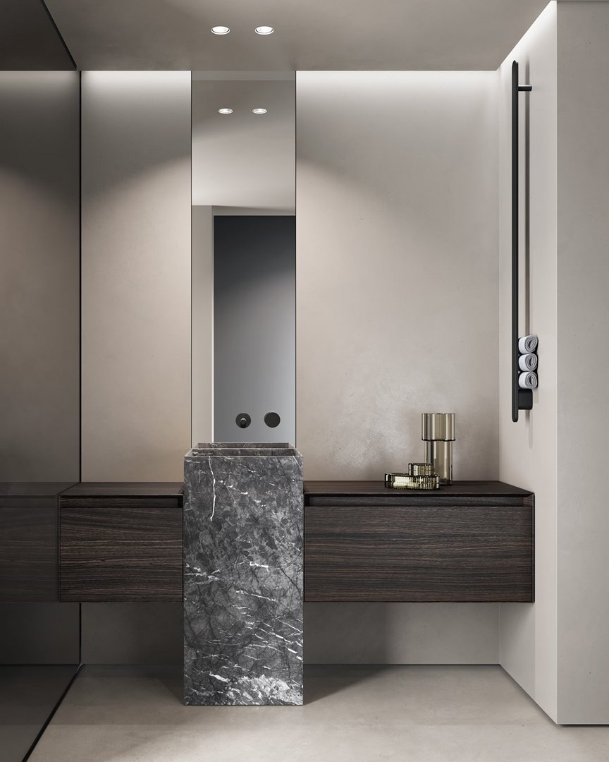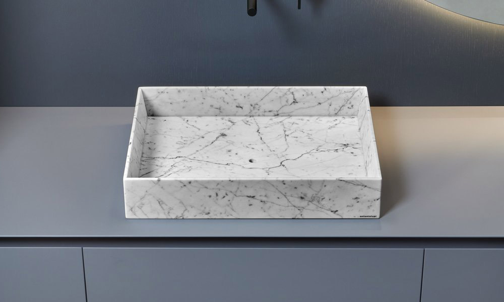 The Nabatei sinks collection, named after the merchant people of ancient Arabia, consists of a series of solid marble tops carved to form the basin of the sinks and storage compartments. Sinks of different shapes and sizes, drawn by orthogonal geometric lines defined by thin thicknesses of the material. An essential sign that is enhanced by the uniqueness of the stone, the infinite chromatic shades, the unrepeatable variations of color.