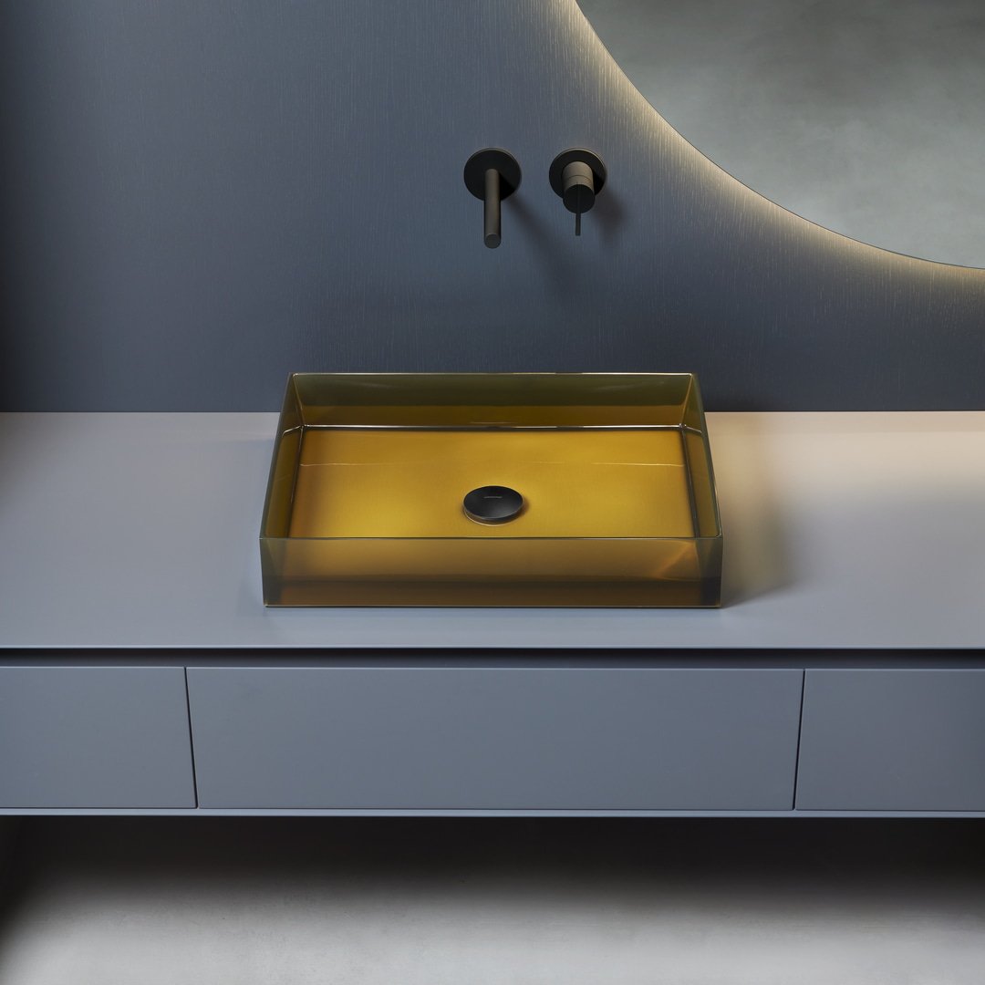 The collection is completed by the top mounted sinks with reduced height volumes, light elements that rest delicately on the top, both in the oval version made of cristalmood and in the rectangular version, available in cristalmood or marble.