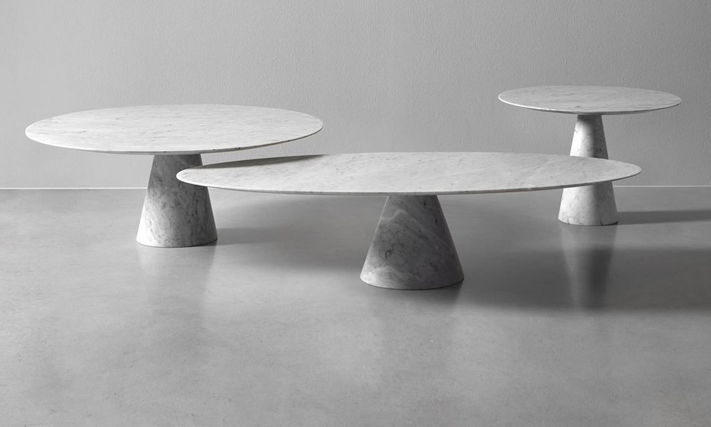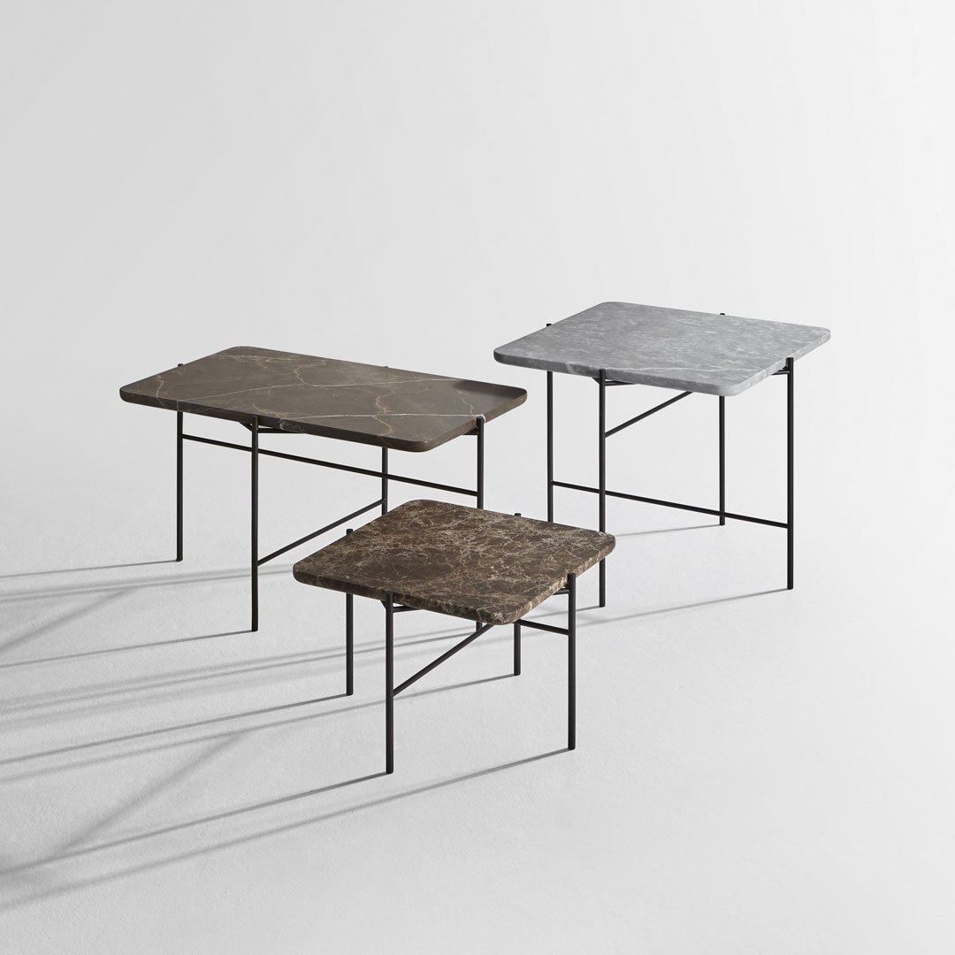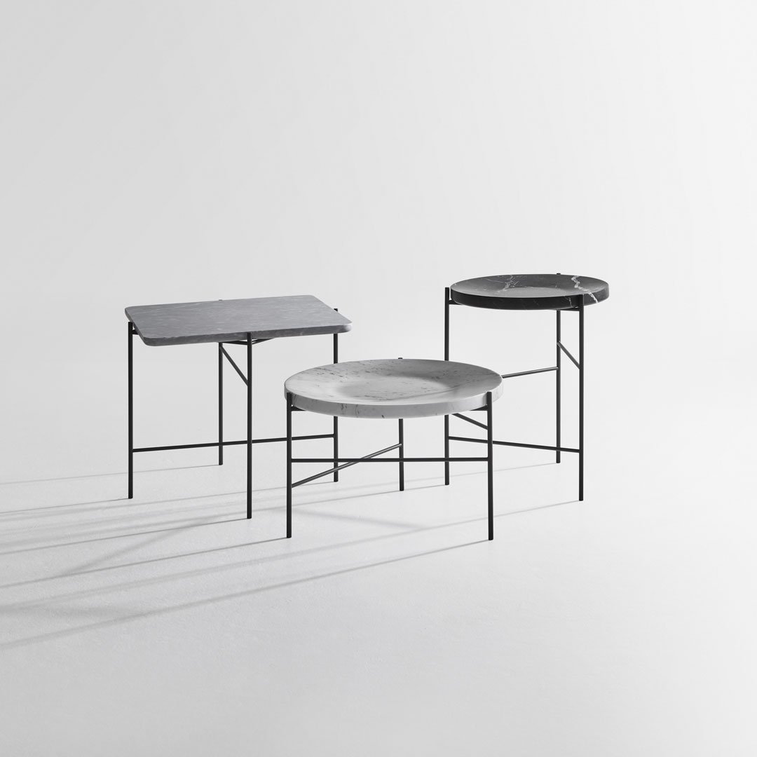 Thin profiles in black lacquered steel intersect to create a structural support grid; a supporting structure of precious tops made with different shapes, thicknesses and stone materials. Paesaggi Sospesi is the name of the collection of 5 coffee tables of different sizes, designed to be used individually or together, giving life to a very personal domestic landscape. The different heights in fact allow overlapping and integrations, the sophisticated colors and the unique shades of the marble define new compositions because of the relationship they establish with light. From above they appear as archipelagos of islands or artificial terraces, mountain ranges or cultivated land. Everyone can read a familiar landscape, obtained from free joints and positioning, which can be transformed and modified over time. A perfect collection for both the living area and the bathroom.