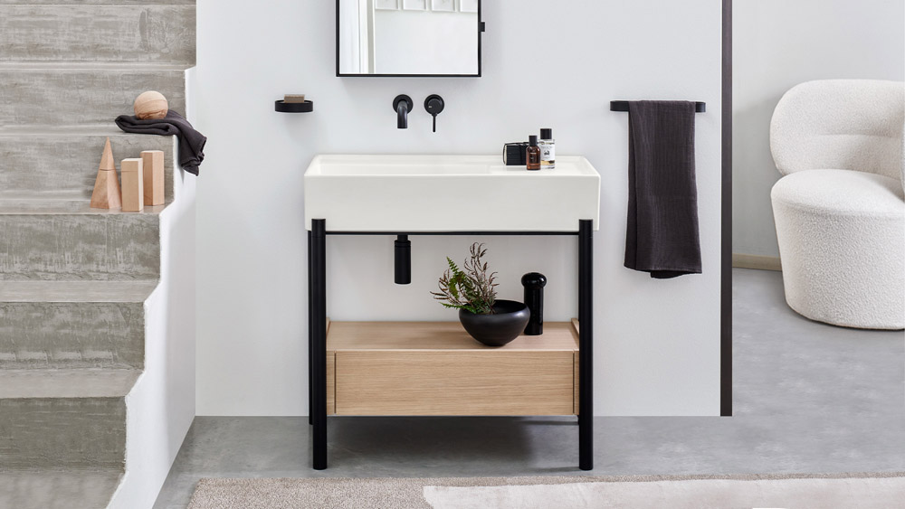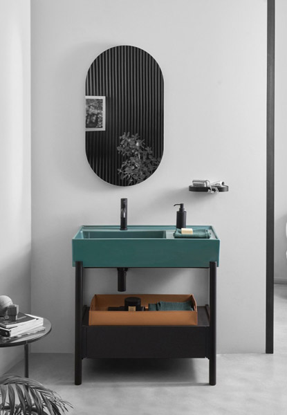 A ceramic washbasin with a large bowl and a convenient side shelf available in many finishes with a structure available in painted steel finish or wood in various precious natural wood finishes, modular with a shelf or a generous low drawer, both in lacquered wood or in natural wooden finishes. All completed by leather baskets of different sizes.