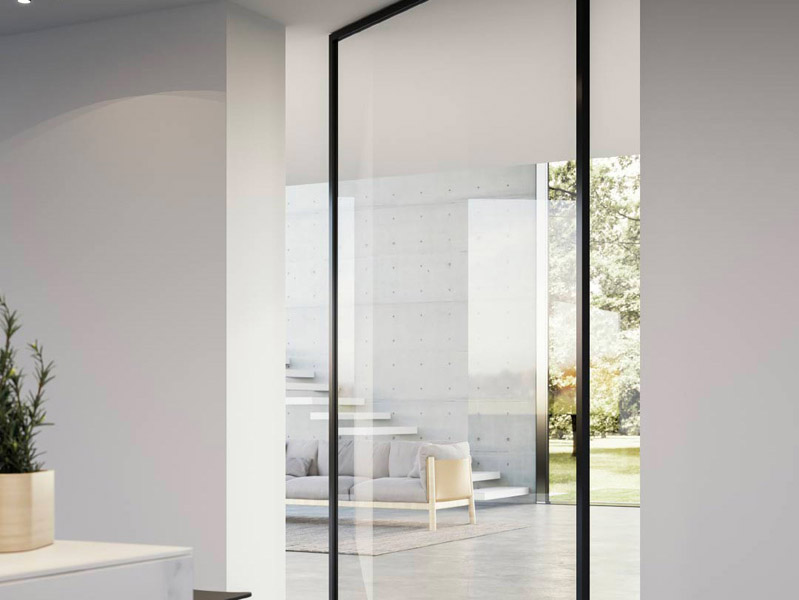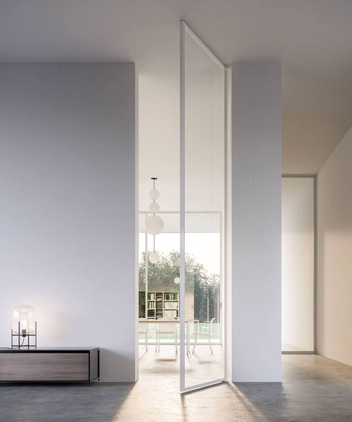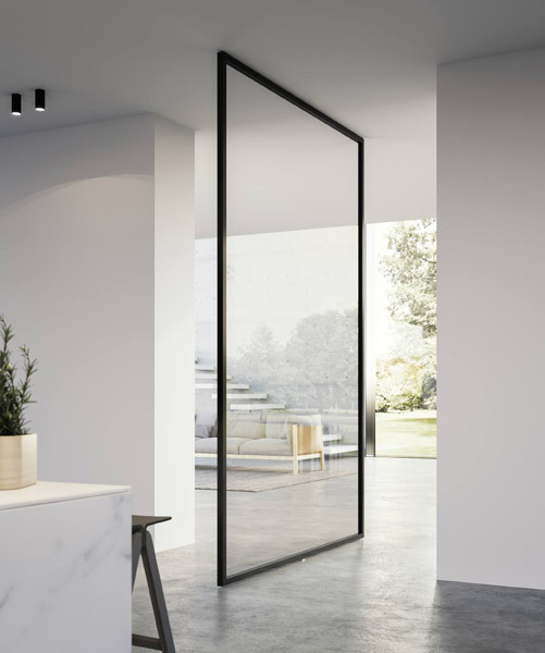 Collection of sliding doors and pivot doors with single glazing and aluminium frames, ideal for recreating movable walls. The Quadra line of doors combines technical rigour with a minimalist aesthetic. The door frame is distinguished by a profile with a square cross section (36mm wide and 38mm deep), with central glass designed to create large panels (up to 7sqm for sliding panels) to create veritable movable walls.