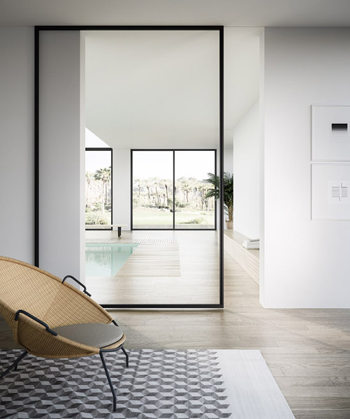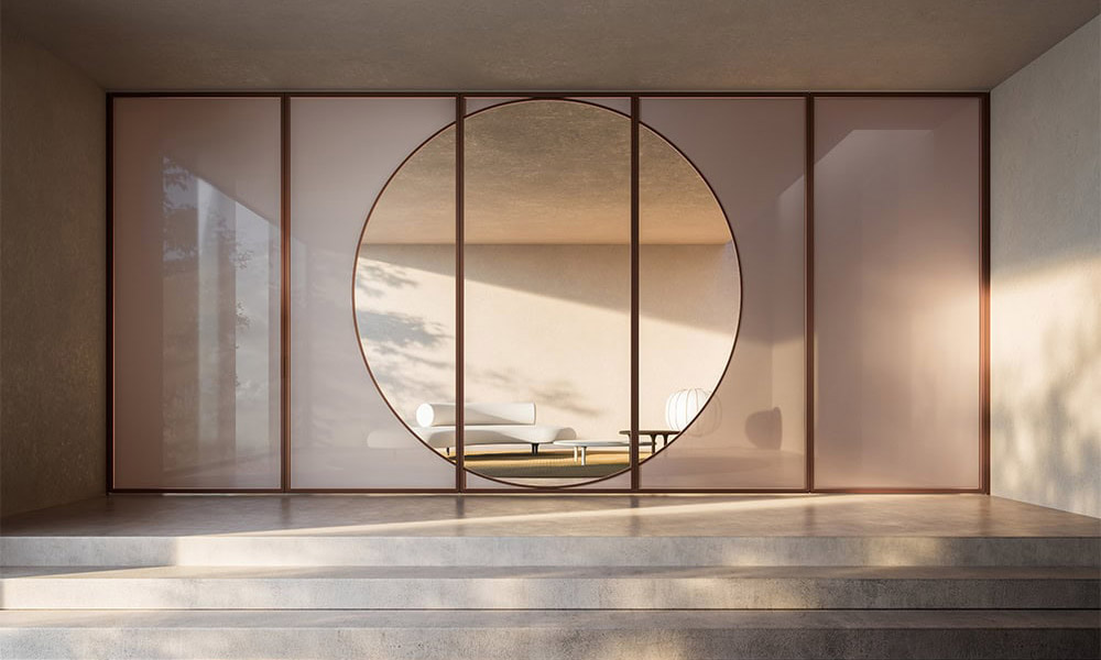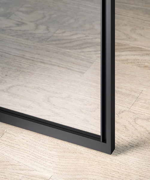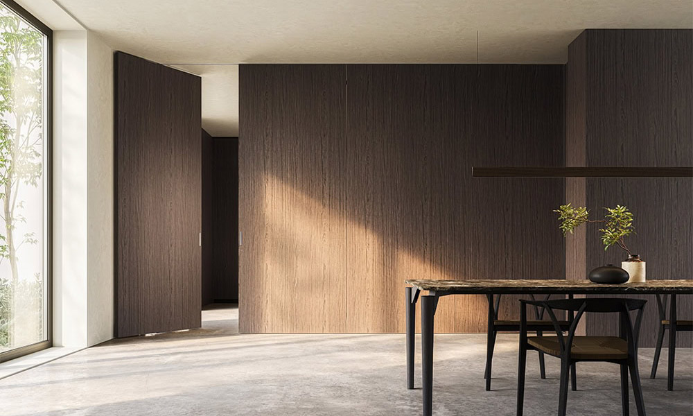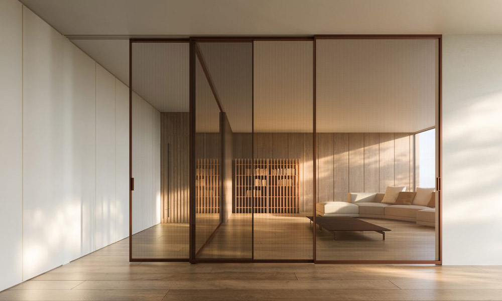 he main feature of Quadra sliding door is the square cross section running along the entire framework of the panel, which allows one to create veritable movable walls. By integrating the handle in the upright rod, Quadra slides silently within the living space, dividing and connecting it at the same time.