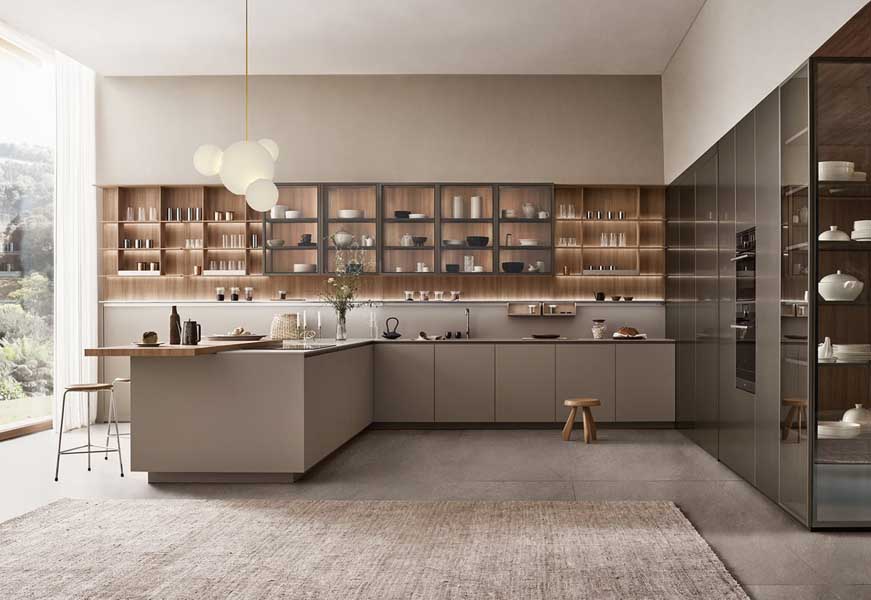 A concept of the home as an open space, in which rooms can interact and integrate with each other. The kitchen is no longer interpreted as just an enclosed working space; instead, it is a genuine extension of the living area, the fulcrum of the home, dedicated to spending time together. In design terms, Sign, the new kitchen created for Ernestomeda, is conceived with contents of high formal and aesthetic value but without neglecting the functional aspect, with equipment performance levels very close to professional standards. Sign is a kitchen with an informal character, with a strong focus on materials, in a mix of colours that generates very elegant interiors with strong emotional impact. The centre of the kitchen’s design is the elegant open boiserie structure, with enclosed wall units replaced by shelves and glass-fronted cabinets, real display areas that create continuity and harmony with the living area. Perfectly integrated in the cupboard systems, Inside Passage is the patented system of doors which rotate and stow in a pack at the side, custom-designed for Ernestomeda to provide the vital linkage between the kitchen and the adjoining area. Inside Passage gives access to the Back System area, a free-standing structure that covers all the home’s utility functions and can be specifically equipped to suit different requirements, becoming a wine cellar, a laundry, or a pantry for storing food and kitchen utensils. A perfectly organised, equipped area of the home.