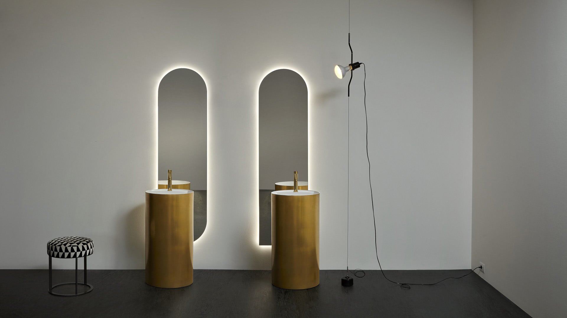 Sometimes it cuts off a corner, others divide the space diagonally and in another case it follows one of the parallel sides. This surface generates a new useful volume and transforms round, square and rectangular basins with thin edges into formal compositions. This accessory becomes the protagonist and functionality becomes form.