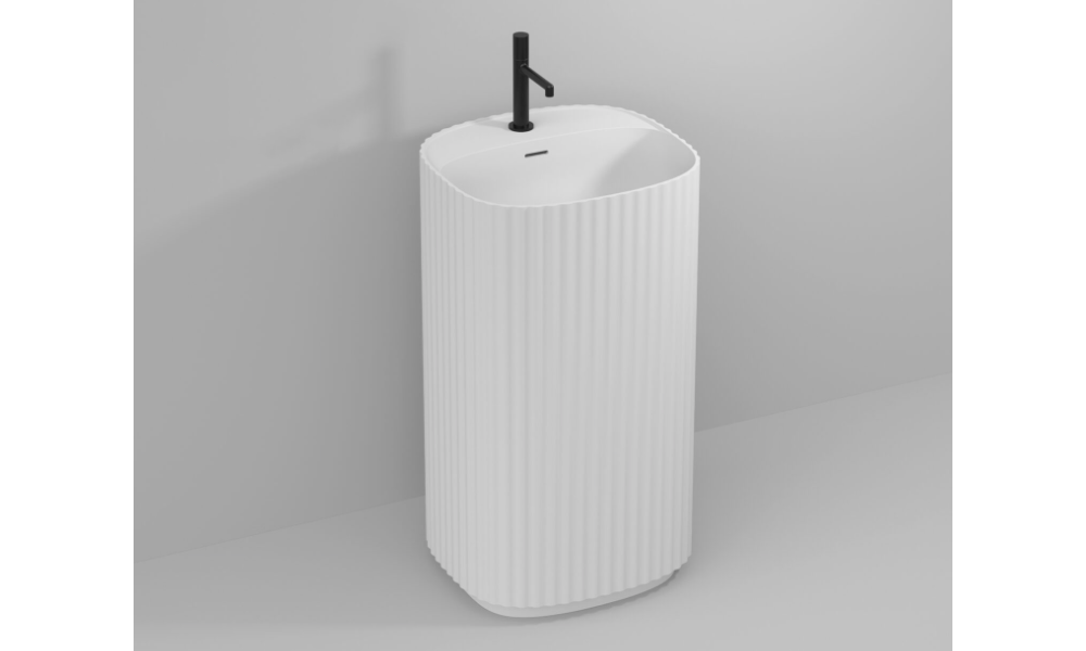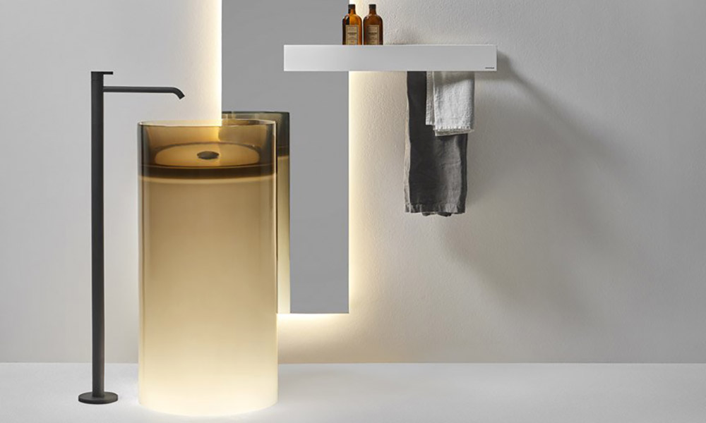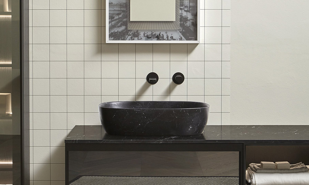 Sometimes it cuts off a corner, others divide the space diagonally and in another case it follows one of the parallel sides. This surface generates a new useful volume and transforms round, square and rectangular basins with thin edges into formal compositions. This accessory becomes the protagonist and functionality becomes form.