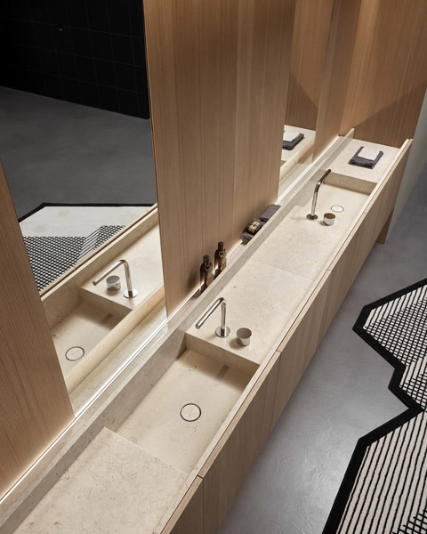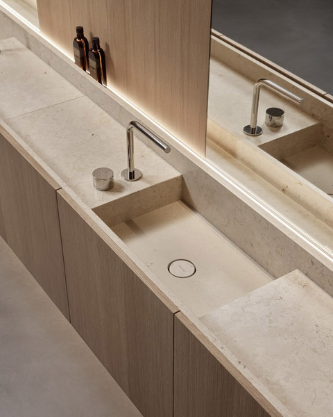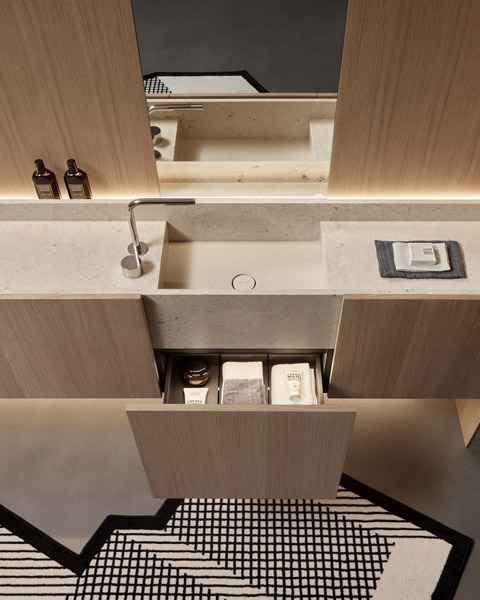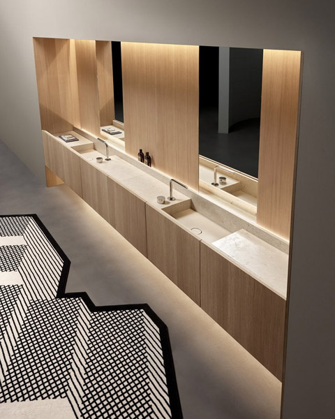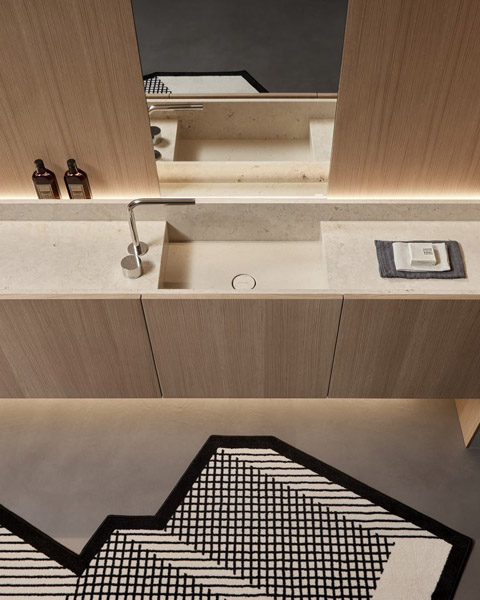 In this composition, the two Street Furniture Pietra Luna tops with back canal and LED lighting, each L 162 cm D 47 cm H 25 cm, both accommodate the integrated sinks. Below, the Street Furniture collection cabinet in Rovere Naturale, L 324 cm D 49 cm H 50 cm, is made up of two sink units and four cabinets; the composition is completed with backlighting, internal lighting and inferior lighting. On the wall the MARULA_WOOD paneling in Rovere Naturale wood.