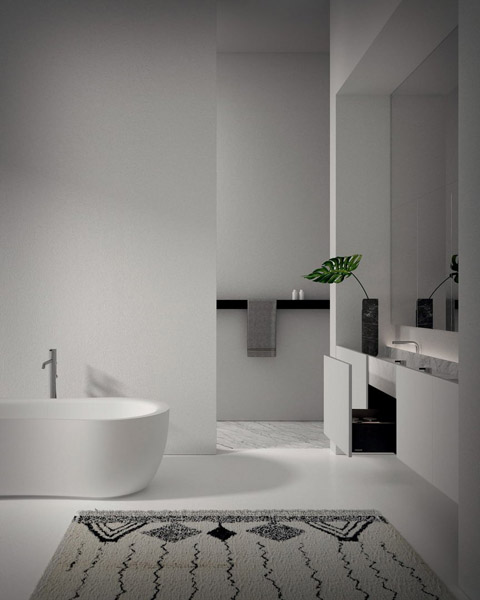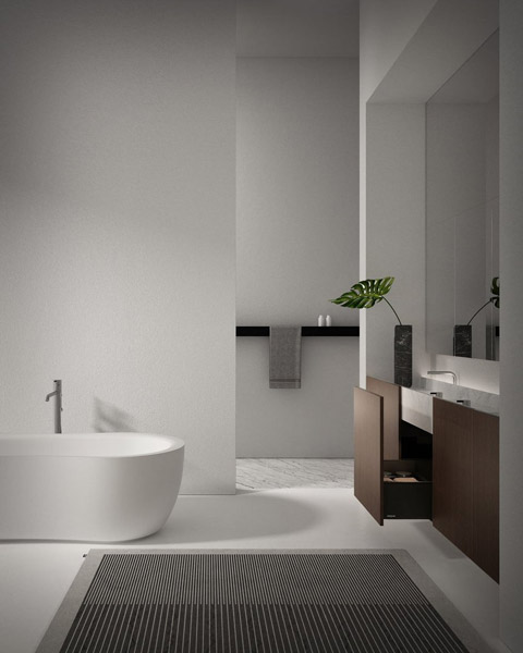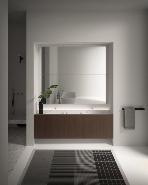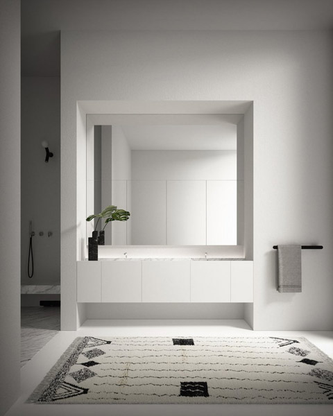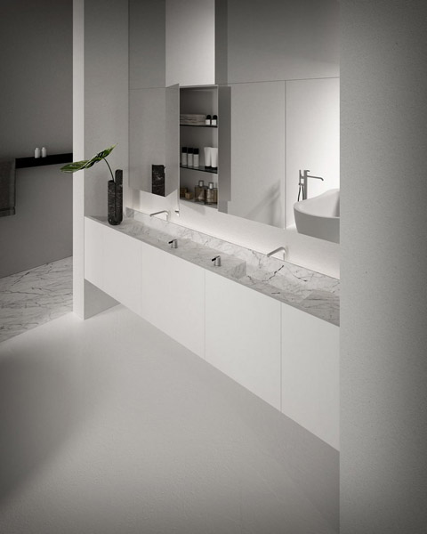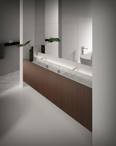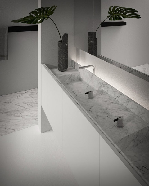 In the cabinet-integrated version it dialogues with the finishes, textures and colors of the fronts revealing itself to the eye only from close up, while when suspended it allows the full perception of the uniqueness of the material. The essentiality of man’s gesture meets the uniqueness of nature, which finds its highest expression in marble. The whiteness and classic beauty of Bianco Carrara, the mysterious charm of Nero Marquina, the flickers of color and bright reflections of Rosso Levanto, unrepeatable aesthetic effects for a proposal that redefines the hierarchy of the bathroom space.