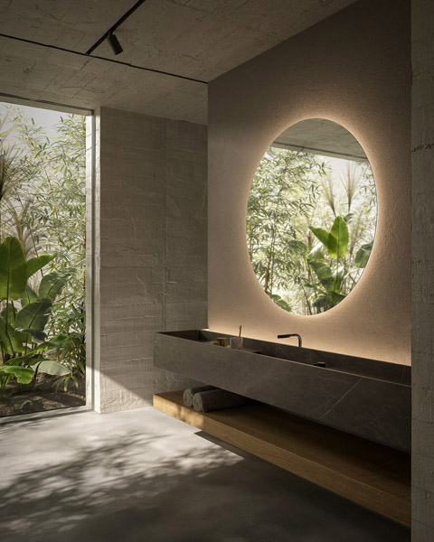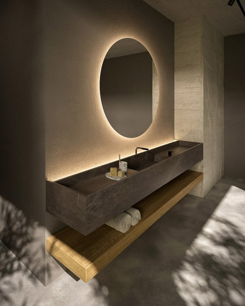 In the second composition Street top in Collemandina marble with back canal and led lighting, L 216 cm D 47 cm H 25 cm, houses the sink integrated. Below, the shelf in Rovere Naturale, L 216 cm D 47 cm H 25 cm.