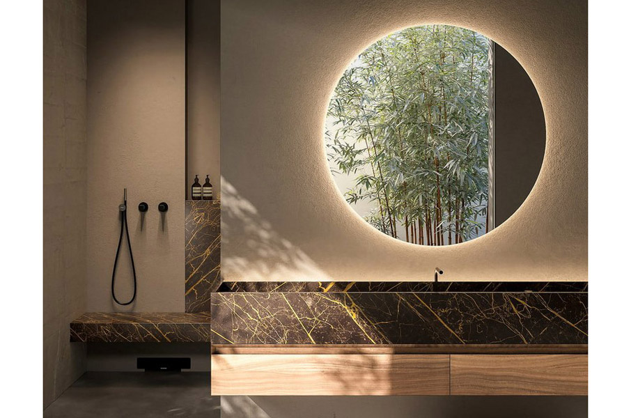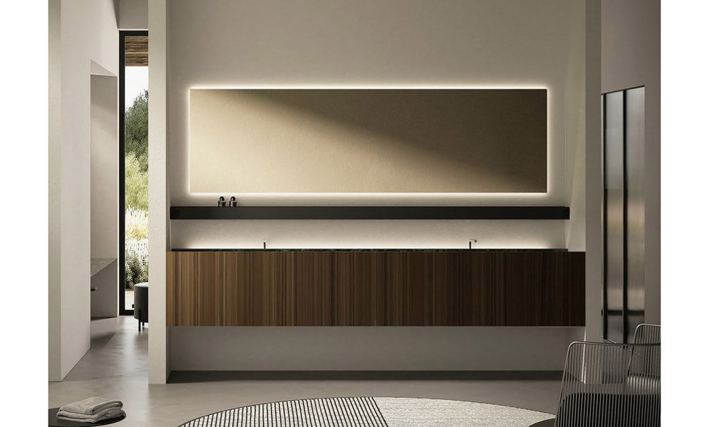 In the first composition Street top in Port Laurent marble with back canal and led lighting, L 216 cm D 47 cm H 25 cm, houses the sink integrated. Below, the cabinet from the Panta Rei collection in Noce Canaletto, L 216 cm D 47 cm H 25 cm.