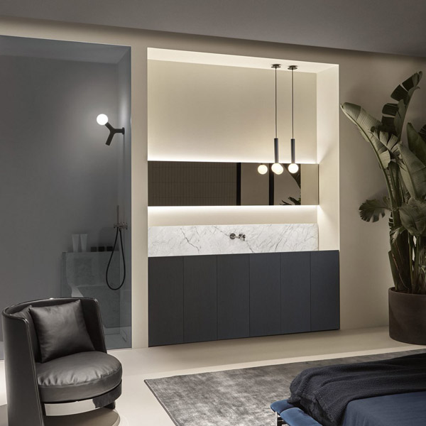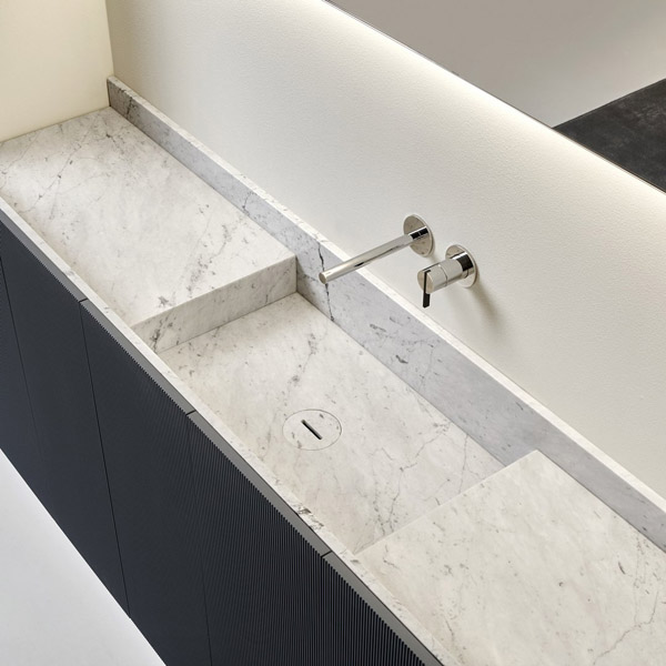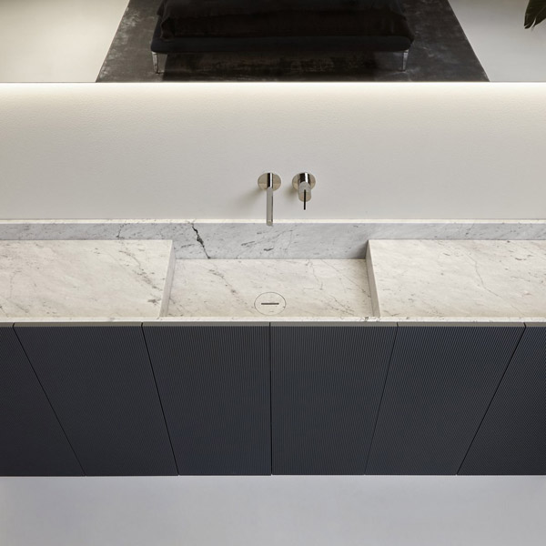 In the cabinet-integrated version it dialogues with the finishes, textures and colors of the fronts revealing itself to the eye only from close up, while when suspended it allows the full perception of the uniqueness of the material. The essentiality of man’s gesture meets the uniqueness of nature, which finds its highest expression in marble. The whiteness and classic beauty of Bianco Carrara, the mysterious charm of Nero Marquina, the flickers of color and bright reflections of Rosso Levanto, unrepeatable aesthetic effects for a proposal that redefines the hierarchy of the bathroom space.