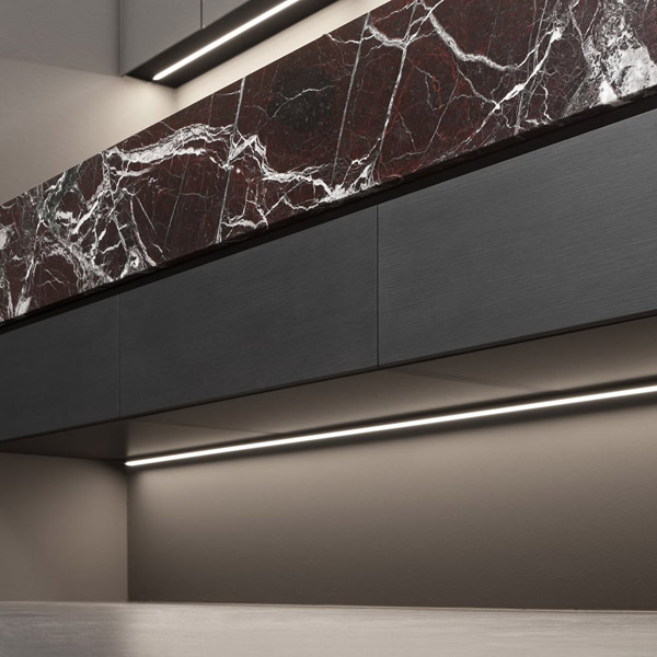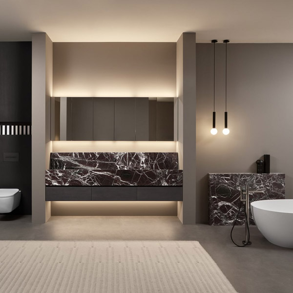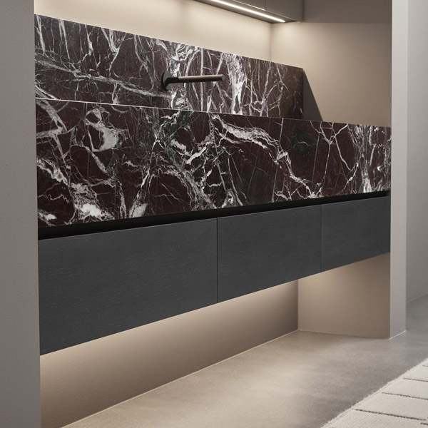 In the cabinet-integrated version it dialogues with the finishes, textures and colors of the fronts revealing itself to the eye only from close up, while when suspended it allows the full perception of the uniqueness of the material. The essentiality of man’s gesture meets the uniqueness of nature, which finds its highest expression in marble. The whiteness and classic beauty of Bianco Carrara, the mysterious charm of Nero Marquina, the flickers of color and bright reflections of Rosso Levanto, unrepeatable aesthetic effects for a proposal that redefines the hierarchy of the bathroom space.