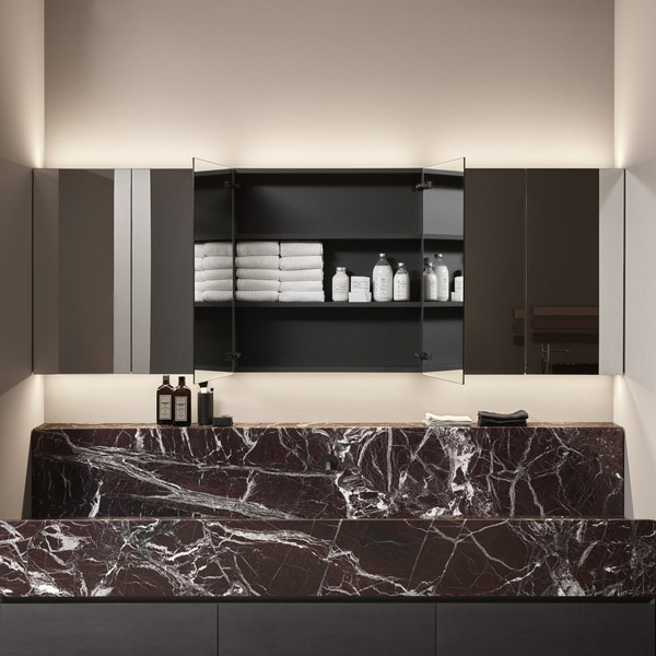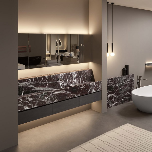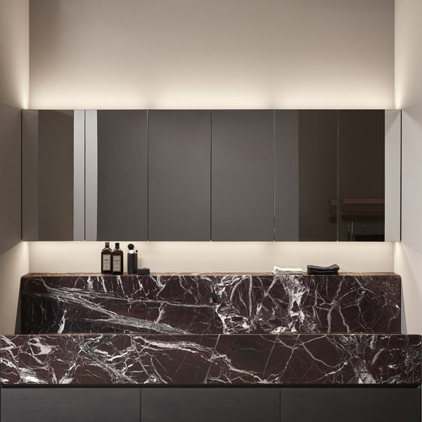 In this composition, the Street top in Rosso Levanto marble, L 216 cm D 40 cm H 25 cm, houses the integrated sink and is completed by the back shelf. Below, the cabinet from the Bestreet collection in Rovere Grigio, L 216 cm D 40 cm H 25 cm, is composed of a sink unit, two cabinets and lower LED lighting.