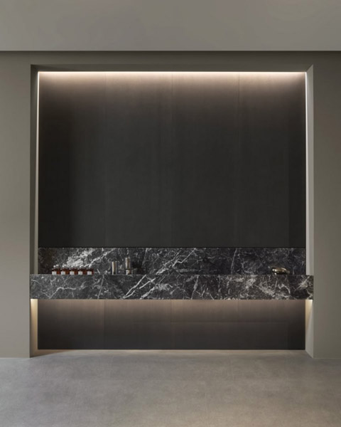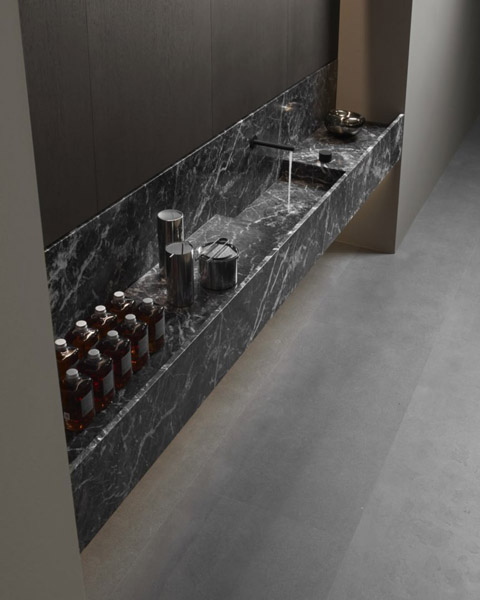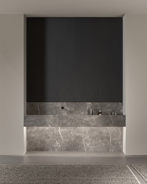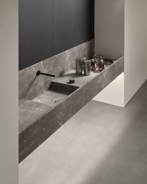 In the second composition, Street Console in marble Grigio Lavico, L 288 D 40 cm H 50 cm, has an integrated sink. On the wall the panelling MARULA_WOOD is in Rovere Grigio.