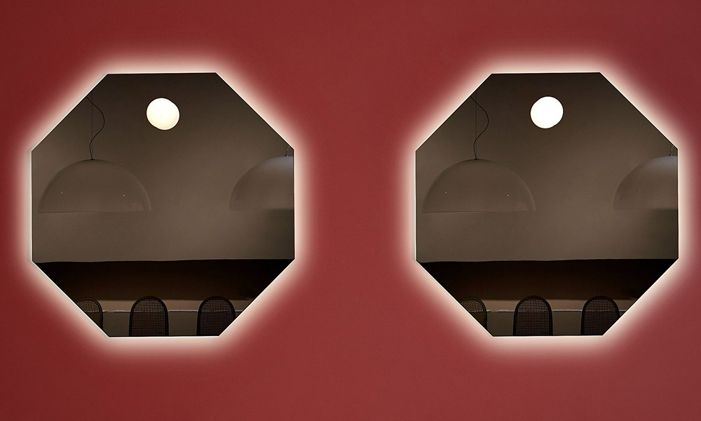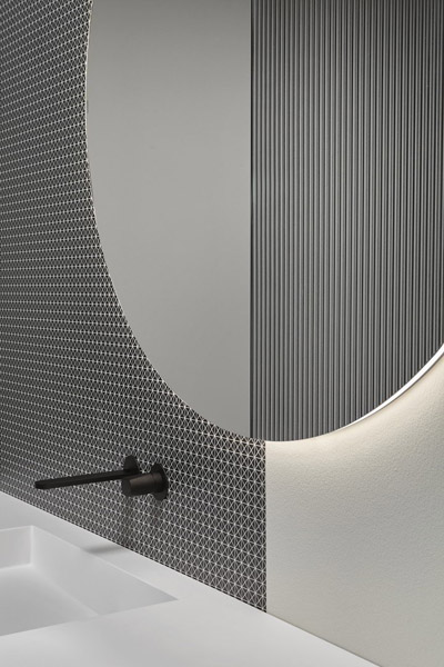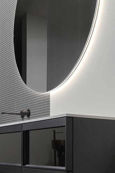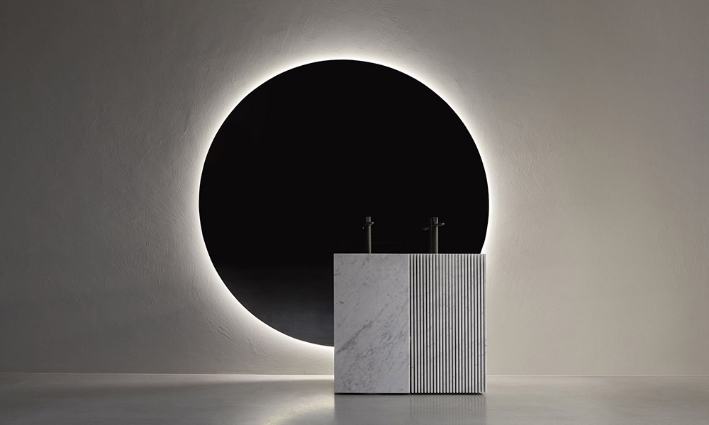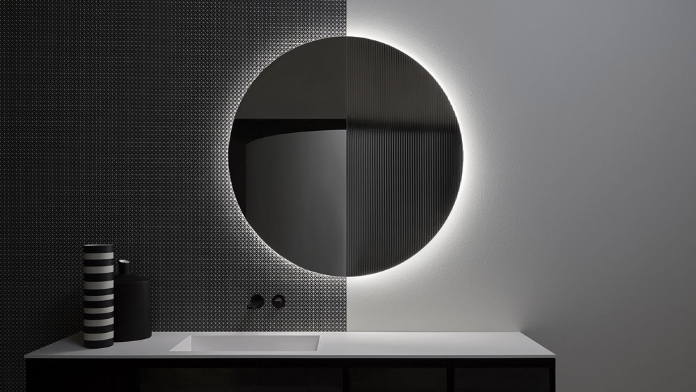 Superluna is the decorative bathroom mirror with a pure round shape and geometric expression. This wall mirror consists of two elements, one that performs as the mirror and the other the ornamental decorative side with a sober and elegant silver ribbed motif. Superluna is equipped with perimeter led lighting, which creates effects of architectural depth on the supporting wall.