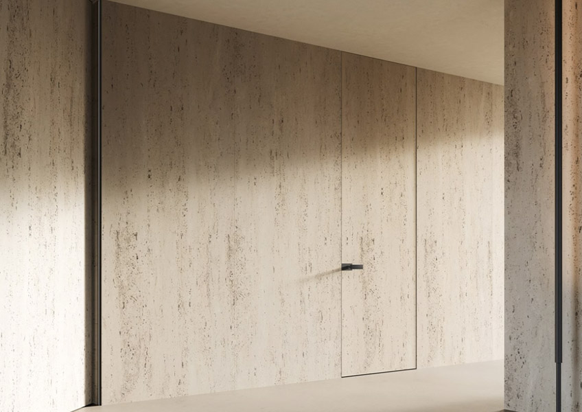 The flush door is distinguished by a wooden panel (51mm thick) fitted with a lock and a handle with a circular plate. The jamb, on two or three sides, becomes an imperceptible feature that allows the door to completely meld with the wall.